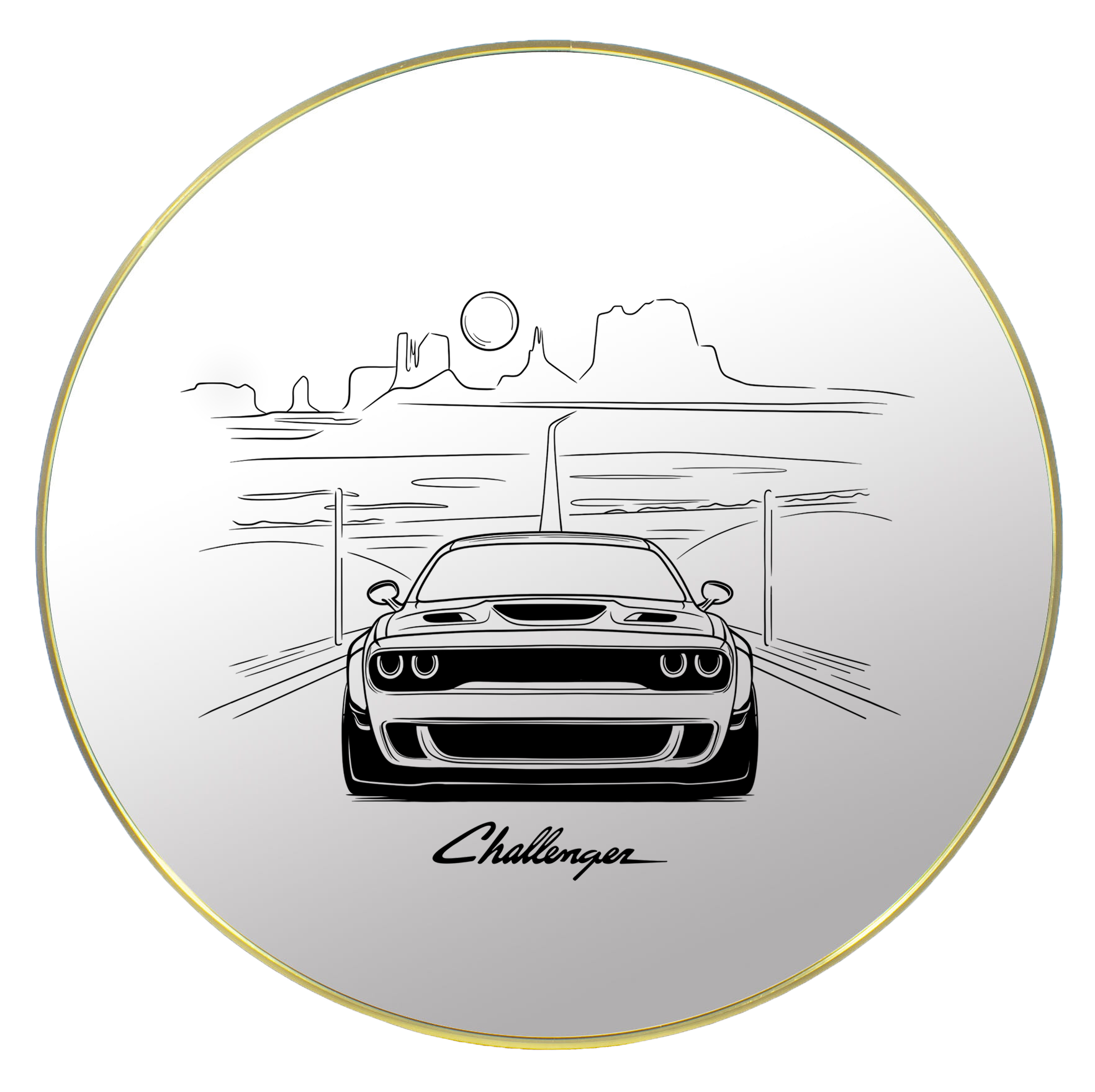 Poczuj klimat amerykańskich dróg bez końca. To wyjątkowe lustro łączy w sobie elegancję nowoczesnego dodatku do wnętrz i pasję do motoryzacji. Na tafli szkła wygrawerowany został potężny Dodge Challenger, uchwycony w dynamicznej perspektywie, z tłem pustynnego pejzażu i niekończącej się trasy.