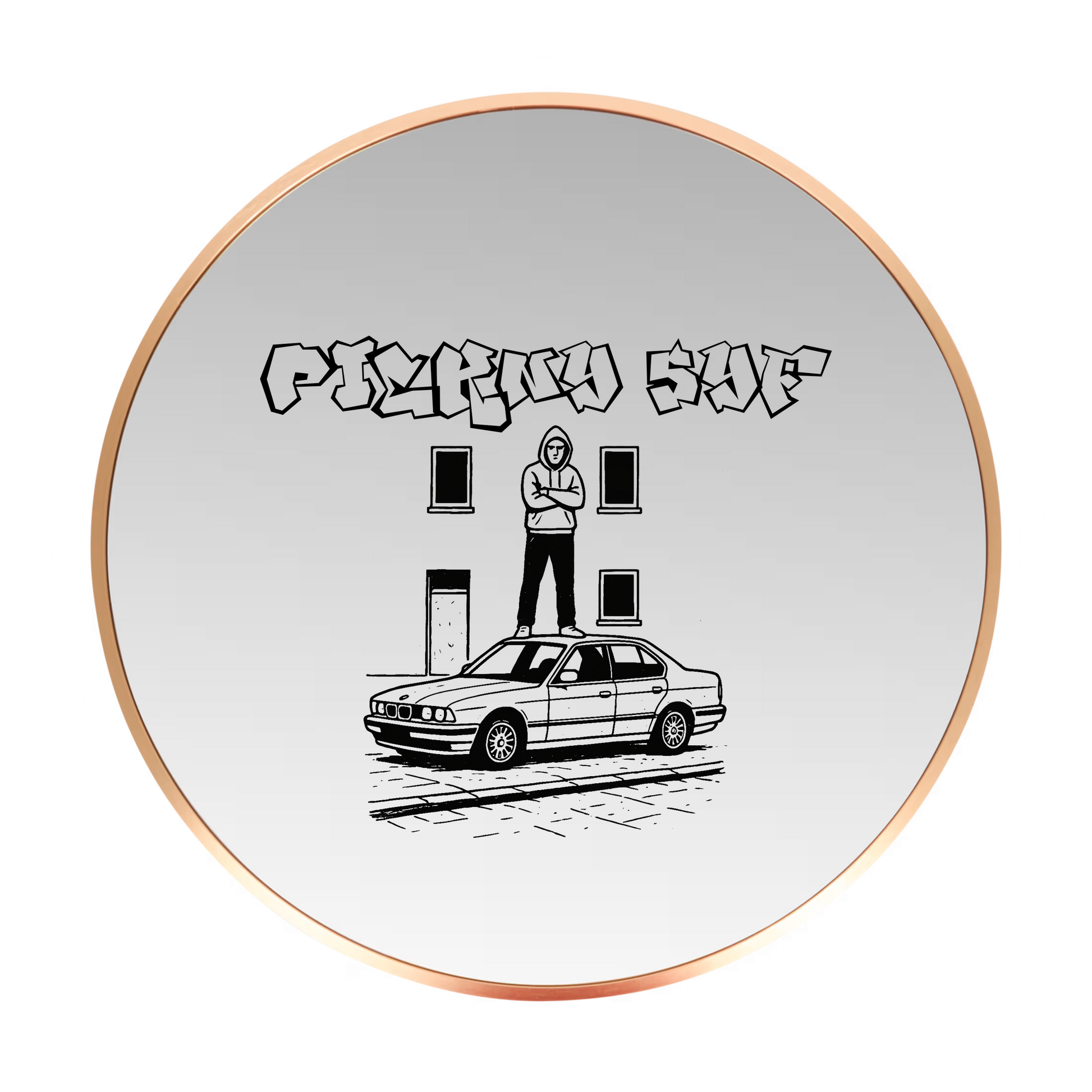 Prosto z osiedla na Twoją ścianę – Kukon stojący na dachu e34, nad nim wielki napis „PIEKNY SYF” w stylu graffiti. To nie jest zwykły plakat, to lustro, które wieczorem świeci jak koguty na blokach i wbija w fotel każdego, kto wejdzie do pokoju.