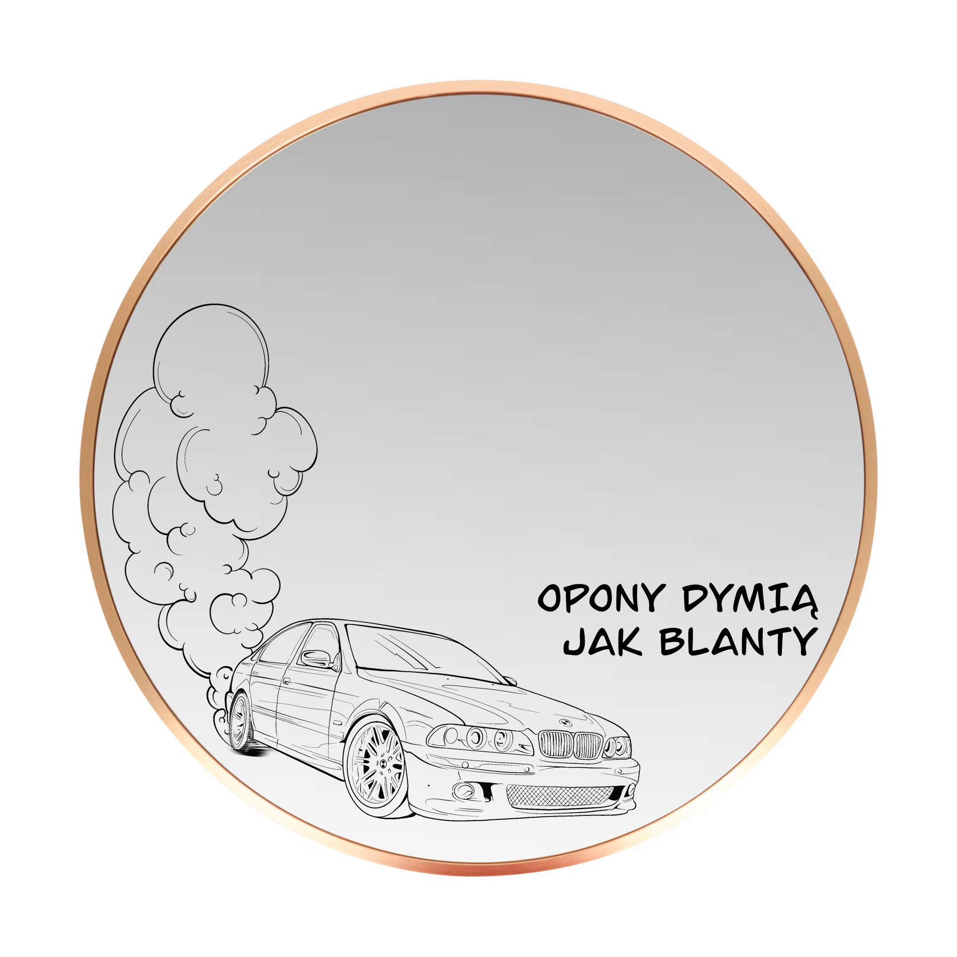 Lustro o średnicy 50 cm z podświetleniem LED i unikalnym grawerem inspirowanym utworem „Monza” od PRO8L3M. W centrum grafiki znajduje się dynamiczna scena z palącym gumę BMW oraz kultowym cytatem: „Opony dymią jak blanty” – hołd dla stylu życia zakorzenionego w motoryzacyjnej pasji i ulicznej poetyce.
